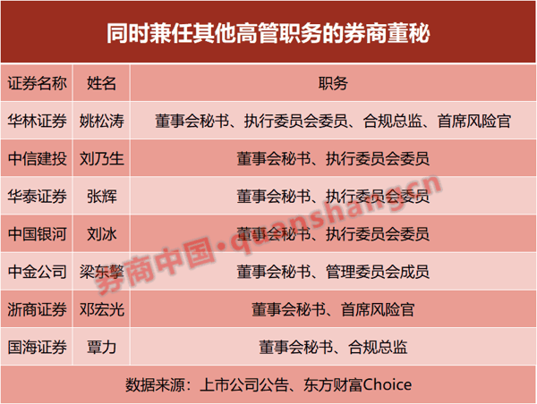 具体来看, 华泰证券 董秘张辉兼执行委员会委员;银河证券董秘刘冰兼任执行委员会委员; 中信建投 董秘刘乃生兼执行委员会委员; 中金公司 董秘梁东擎兼管理委员会成员; 国元证券 董秘李洲峰兼执行委员会委员; 华林证券 董秘姚松涛兼执委会委员、合规总监、首席风险官。