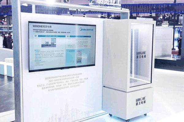工业货梯领域,美的展示全球载重量第一的落地应用货梯——菱王50吨超大载重电梯,支持集装箱、货车直接“上楼”,省去二次转运,提升物流效率,破解超重载货垂直运输难题。