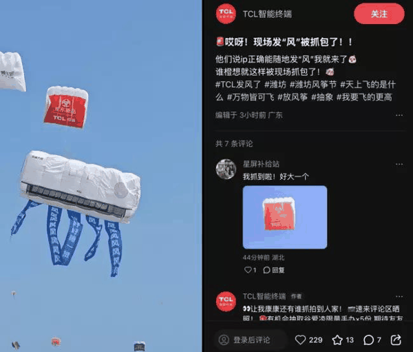 新品上市仅靠发布会远远不够——TCL深睡大师正处于口碑积累的关键期。潍坊风筝节成为了一次巧妙的“空中引爆”:通过线下创意媒介的大范围曝光,引导线上种草与口碑发酵,让用户在笑声中、在互动中、在社交分享中,自己发现“原来我需要的就是这样一台空调”。