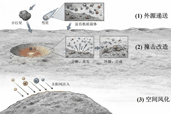 早期太阳系中,小行星和彗星像“快递员”一样,不断向地球等类地行星输送有机质以及碳、氮、氧、磷、硫等与生命相关的元素,为生命起源提供了化学原料。然而,地球地质活动活跃,早期记录大多被破坏。相比之下,月球地质活动较弱,更可能保存这些地外有机质的“原始档案”。