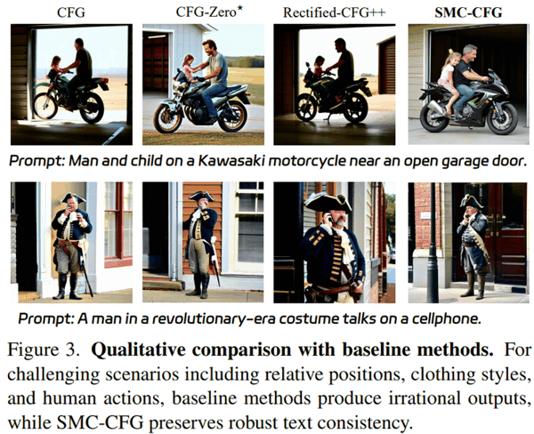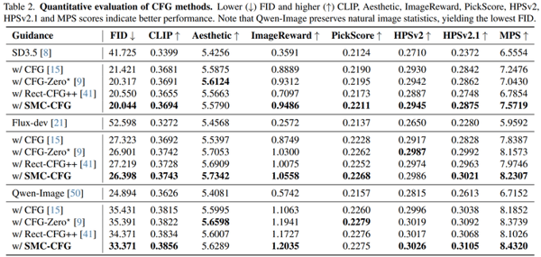 研究还把它与 CFG-Zero* 和 Rectified-CFG++ 这些已经改进过的方法做了比较,结果显示,SMC-CFG 依然能够继续取得提升,而且这种优势不是某个指标上的局部突破,而更接近整体性的领先,这也说明它不是简单技巧,而是机制层面的改进。