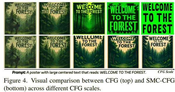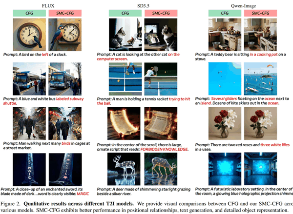 与此同时,在复杂 prompt 下,传统方法容易出现空间关系错位、结构混乱、文字模糊或错误等问题,而 SMC-CFG 在空间关系、细节稳定性和文字清晰度上都更好,这说明它不仅分数更高,也确实提升了模型对复杂结构和关系的理解能力。