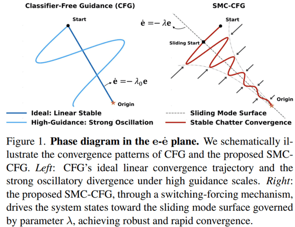 研究人员说明,根本原因在于 CFG 本质上是在做线性误差放大,而 diffusion 本身却是一个非线性系统,所以一旦放大过头,就容易出现振荡和发散。也正因为如此,研究团队引入了滑模控制这种非线性控制方法,让系统在复杂情况下也能被拉回更稳定的轨道。