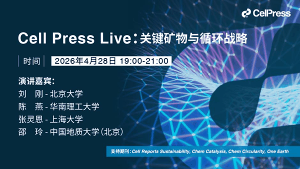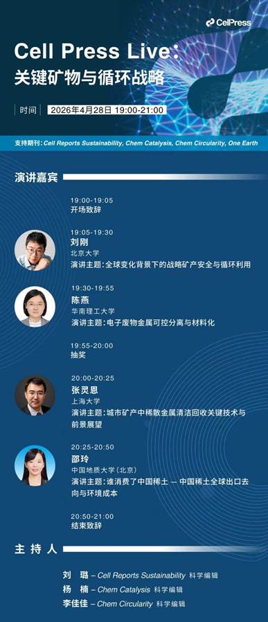 作为《2026年首场Cell Press Live直播讲座》,Cell Press细胞出版社旗下可持续发展/物质科学期刊家族中的Cell Reports Sustainability, Chem Catalysis, Chem Circularity,One Earth联合邀请了北京大学刘刚教授、华南理工大学陈燕教授,上海大学张灵恩副教授及中国地质大学(北京)邵玲副教授,共同分享和探讨关键矿物与循环战略的可行路径。