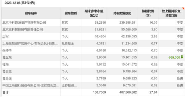 不过,2023年一季度,葛卫东的另一名关联人葛贵莲出现在中科曙光的前十大股东名单中。到了2023年12月6日,葛卫东及其关联人葛贵莲、葛贵兰均现身中科曙光前十大股东中。