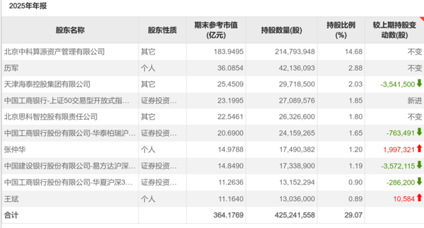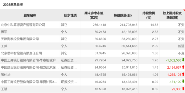 中科曙光 年报显示,截至2025年底,葛卫东的关联人王萍从该公司前十大股东名单中消失。截至2025年底,该公司第十大股东王斌持有1303.6万股。