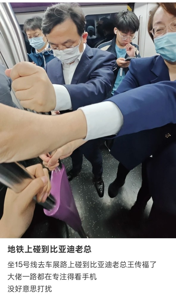 在2023年的上海车展期间,比亚迪非执行董事夏佐全在个人微信朋友圈,发布了王传福在上海乘坐地铁参加当时车展的照片。