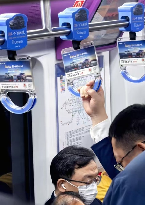 还有细心的网友注意到,他们所乘坐的15号线车厢里,把手上刚好是比亚迪宋Ultra EV的广告,几位高管还在认真翻看。