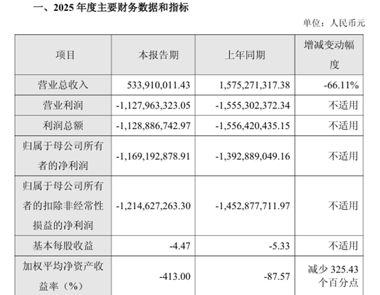 数据显示,2025年公司实现营业总收入5.34亿元,同比下降66.11%;归母净利润亏损11.69亿元;扣非净利润亏损12.15亿元。