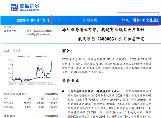 而就在航天宏图股价1月12日创下阶段高点次日,1月13日,国海证券发布了关于航天宏图的研报,标题为:《航天宏图(688066.SH):海外业务增长可期,构建商业航天全产业链》。