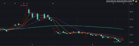 2025年12月以来至2026年1月12日,航天宏图股价表现强势,期间股价一度冲至49.8元/股(前复权),期间涨幅超过70%。此后,公司股价持续下滑,截至2026年4月9日收盘,航天宏图股价已较2026年1月高点累计下跌约五成。