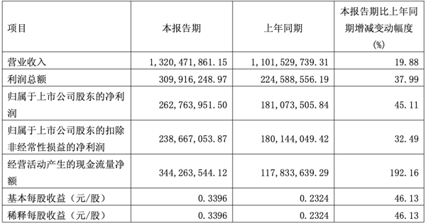 公司2026年1-3月累计实现营业收入13.20亿元,同比增加2.19亿元,增幅19.88%。
