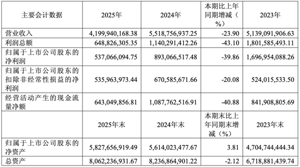 2025年,公司实现营业总收入42亿元,同比下降23.90%;归母净利润5.37亿元,同比下降39.86%;扣非净利润5.36亿元,同比下降20.08%;经营活动产生的现金流量净额为6.43亿元,同比下降40.88%; 报告期内, 中炬高新 基本每股收益为0.7003元,加权平均净资产收益率为9.41%。公司2025年度分配预案为:拟向全体股东每10股派现4.5元(含税)。
