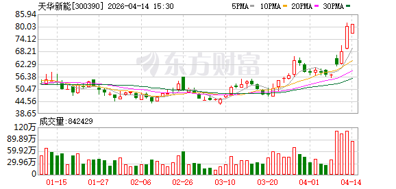 业绩的强势表现直接推动股价走高,在一季度业绩预告发布后的三个交易日, 天华新能 股价累计上涨超40%;截至4月14日收盘,天华新能总市值达673.3亿元,股价为81.05元/股,较一年前上涨340%,股价表现显著强于 赣锋锂业 (002460.SZ)、 天齐锂业 (002466.SZ)等锂盐龙头。