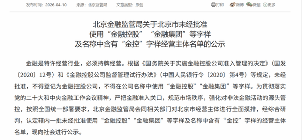 4月10日,北京金融监管局发布《关于北京市未经批准使用“ 金融控股 ”“金融集团”等字样及名称中含有“金控”字样经营主体名单的公示》(以下简称《公示》)。