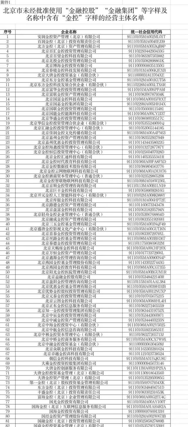 为贯彻落实党的二十大和中央金融工作会议精神,严把金融准入关口,规范市场秩序,强化对非法金融活动的源头管控,按照全国统一部署要求,北京金融监管局会同相关部门对北京市经营主体进行全面摸排,经 综合 研判,认定辖内一批未经批准使用“金融控股”“金融集团”等字样及名称中含有“金控”字样的经营主体名单,现向社会进行公示。