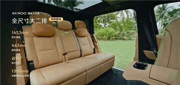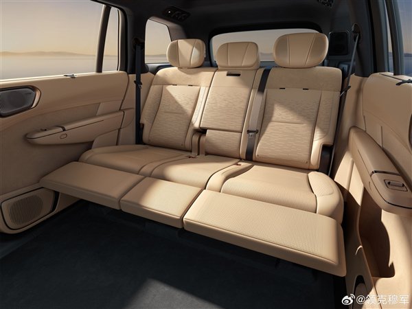 作为大型SUV,领克900车长5240mm、轴距3160mm,座舱得房率高达88.2%。相比六座版,大五座直接把第三排“砍掉”,换来了更夸张的二排空间和后备箱: