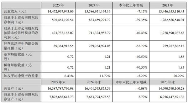 资产方面,截至 2025 年末,公司总资产163.88 亿元,归属于上市公司股东的净资产78.93 亿元,资产负债率保持合理水平。现金流方面,经营活动产生的现金流量净额0.89 亿元,主要因备货增加导致存货增长8.63 亿元。