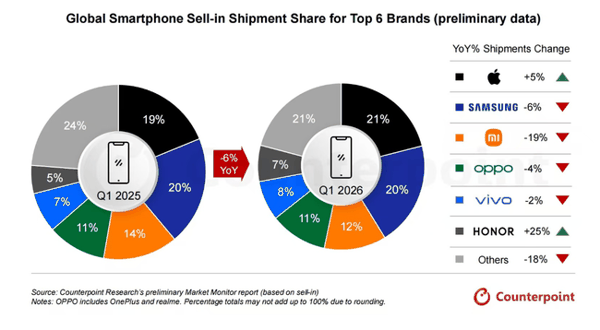 Counterpoint 最新数据报告显示,2026第一季度,全球智能手机出货量同比下降6%,但荣耀、苹果增长强劲,同比增长分别为25%和5%,是头部品牌中唯二实现正增长的手机厂商。