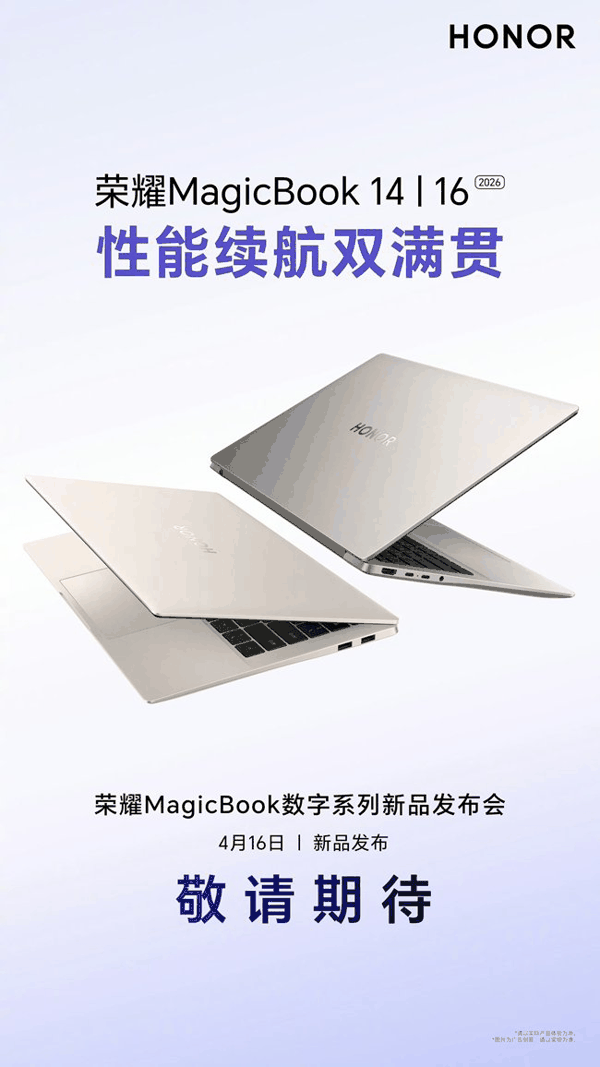 【iMobile爱科技资讯】4月7日,荣耀正式官宣全新荣耀MagicBook 14/16 2026款将于4月16日正式发布,新品以“性能续航双满贯”为核心定位,为轻薄本市场带来年度迭代选择。