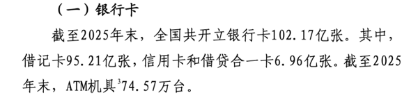 央行近期发布的《2025年支付体系运行总体情况》显示,截至2025年末,全国共开立银行卡102.17亿张,其中借记卡95.21亿张,同比增长3.65%;信用卡和借贷合一卡则降至6.96亿张,跌破7亿关口,同比下降4.26%,较2024年末减少3100万张。
