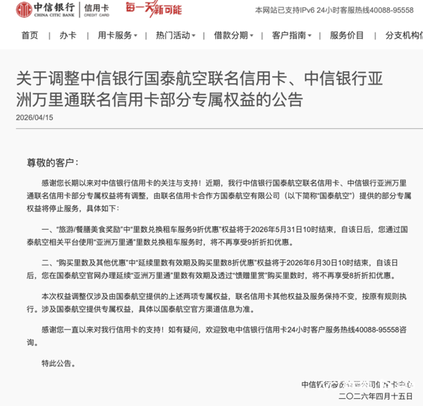 4月15日, 中信银行 信用卡中心发布公告,对 中信银行 国泰航空 联名信用卡、 中信银行 亚洲万里通联名信用卡的部分专属权益进行调整。