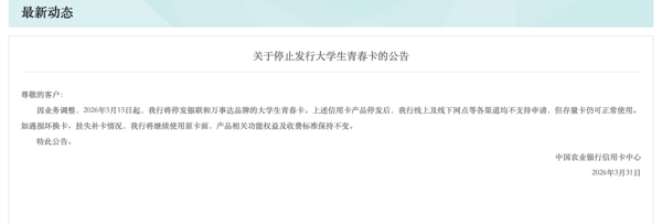 农业银行 信用卡中心则在3月内两次发布停发公告:3月6日公告显示,将于2026年4月16日起停发天柱山信用卡;3月31日再次公告,定于2026年5月15日起,停发银联及 万事达 品牌的大学生青春卡,两次停发均以“业务调整”为由。