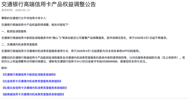 交通银行 则针对高端信用卡权益进行调整。2月12日,该行信用卡中心发布《高端信用卡产品权益调整公告》,明确因市场情况变化,自2026年4月1日起,高端信用卡航班延误险服务中,针对“随心飞”等类似航空公司套餐产品的保障服务将不再提供;同时,高端信用卡沃德境内 机场 贵宾室服务的使用方式将更新,仅支持通过买单吧App扫码使用。