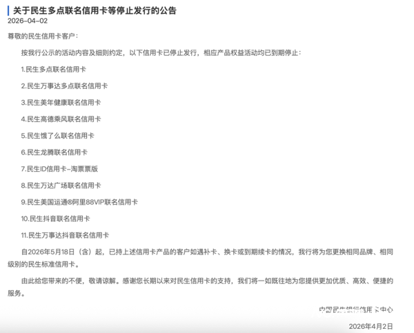 具体来看,4月2日, 民生银行 信用卡中心发布公告称,将停发民生多点联名信用卡、民生 万事达 多点联名信用卡等11款产品,其中多数为联名卡。公告明确,上述产品相关权益活动已全部到期终止,后续将为相关持卡人更换相同品牌、相同级别的民生标准信用卡,保障持卡人正常用卡权益。