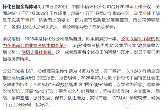 具体来看,怀化电信在3月29日至30日召开的2026年工作会议中指出,“公司以坚韧不拔的毅力在湖南公司业绩考核中勇夺第一”,同时还斩获“业绩考核优秀奖”及集团公司“高质量收入增长奖”,创历史最佳业绩。