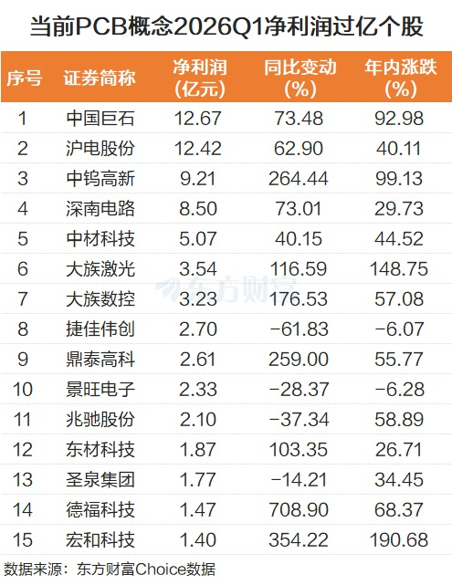中国巨石 暂居PCB概念板块“盈利王”位置,一季度实现归母净利润12.67亿元,同比增长73.48%。 沪电股份 一季度也盈利超过10亿元,为12.42亿元,同比增长62.9%。 中钨高新 、 深南电路 、 中材科技 一季度盈利则超过5亿元。