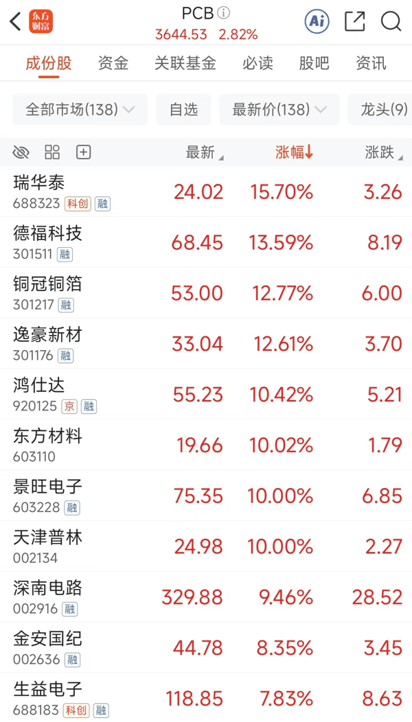 PCB ( 印刷 电路板)板块4月27日早盘表现强势, 东方材料 、 景旺电子 、 天津普林 涨停; 瑞华泰 、 德福科技 、 铜冠铜箔 、 逸豪新材 、 鸿仕达 大涨超10%; 深南电路 、 金安国纪 、 生益电子 明显跟涨。