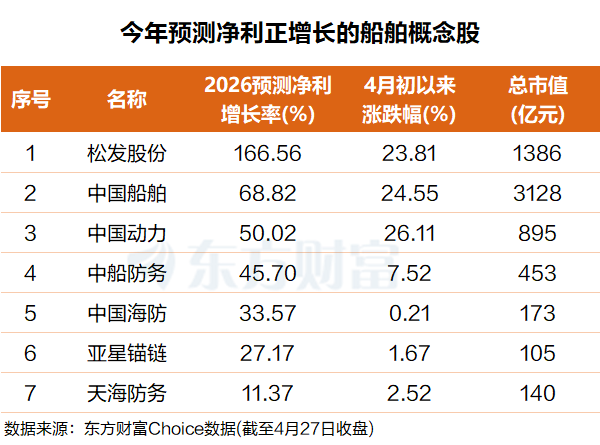 从机构预测净利润增长数据看, 松发股份 排名第一,今年净利润有望增长超166%;中国船舶排名第二,净利润增长有望超68%。