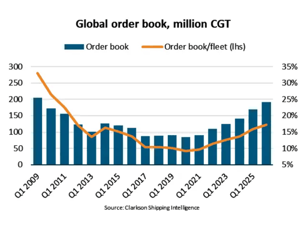 波罗的海国际 航运 公会(BIMCO)于 2026 年 4 月发布的最新市场数据显示,截至一季度末,全球手持订单量达1.91 亿修正总吨(CGT),创下 2011 年以来 17 年新高,相当于现有船队规模的 17%。