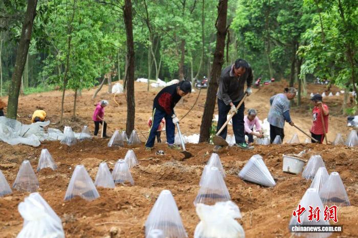 中新网 清远4月18日电 (张璐 刘惠明)近日,走进清远市连南瑶族自治县三江镇东和村,只见村民杨阿姨与同伴们穿梭在山林间,忙着搬运灵芝菌棒。村民们分工明确,配合默契,有人挥锄挖坑,有人俯身盖棒,还有人蹲在田头协调指挥……书写着“林下掘金”记。