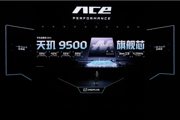 一加 Ace 6 至尊版搭载联发科当代旗舰芯——天玑 9500,其采用台积电第三代 3nm(N3P)工艺与全大核架构,相比上代 CPU 性能提升 32%,功耗降低 55%。GPU 层面,天玑 9500 搭载移动端最强 GPU G1-Ultra,峰值性能相较上一代提升 33%,光线追踪渲染性能大幅提升 119%,功耗降低 42%。