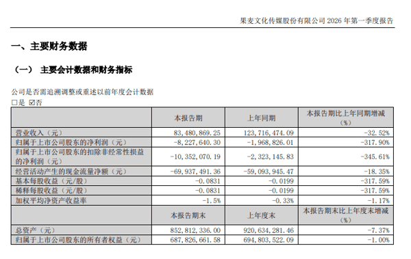 目前,果麦文化股价已自2025年9月高点下跌超六成。同时,果麦文化2025年业绩由盈转亏,2026年一季度亏损扩大。