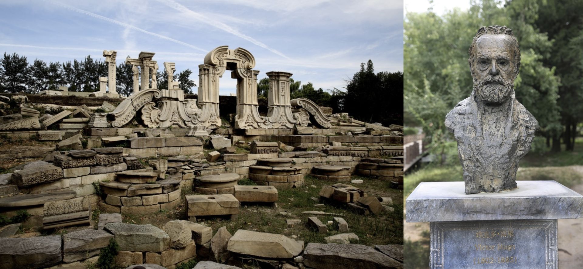 1860年10月,英法联军火烧圆明园,大量文物流失。左图为如今的圆明园西洋楼大水法遗址,图右为2010年10月,为纪念圆明园罹难150周年,由法中友协联合会、中国人民对外友好协会和法国东方华人协会等单位共同捐赠的雨果半身雕像,在圆明园大水法遗址东侧揭幕。视觉中国丨图