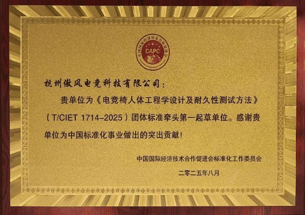 更重要的是,傲风还是《电竞椅人体工程学设计及耐久性测试方法》等多项行业标准的第一起草单位,用技术引领着电竞椅行业的发展。