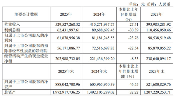 报告显示,2025 年胜科纳米实现营业收入 5.30 亿元,同比增长 27.51%;归属于上市公司股东的净利润为 0.62 亿元,同比下降 23.78%;归属于上市公司股东的扣除非经常性损益的净利润为 0.56 亿元,同比下降 22.54%。经营活动产生的现金流量净额为 2.03 亿元,截至 2025 年末,胜科纳米总资产达 19.73 亿元,归属于上市公司股东的净资产为 8.88 亿元,较上年末增长 46.55%。