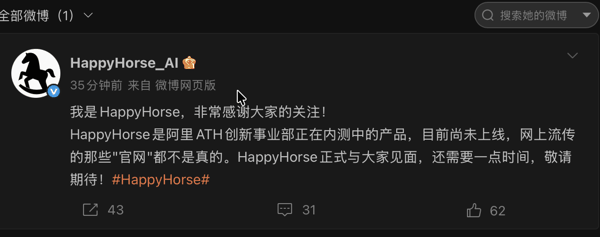 4月10日,阿里认领HappyHorse。(图源: 微博 截图)