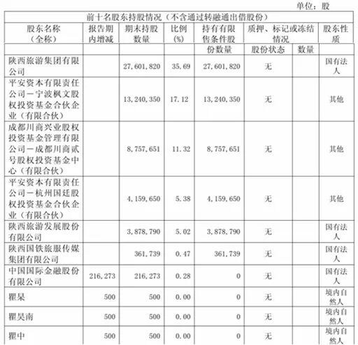 年报显示,瞿杲、瞿昊南、瞿中三名自然人,各持有 陕西旅游 500股股票,并列公司第八大股东。以4月17日收盘价136.90元/股估算,三人的单独持股市值仅约6.85万元,因持股数量过少,持股比例在年报中均显示为“0.00%”。