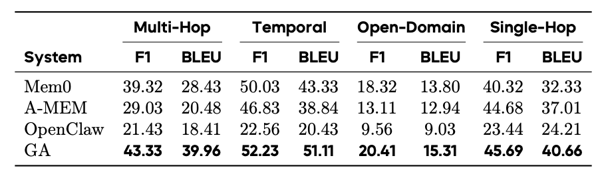 上表为 GA 等在 LoCoMo 上的长期事实记忆评估。GA 基于自身优越的记忆架构设计,确保了记忆的高效召回。