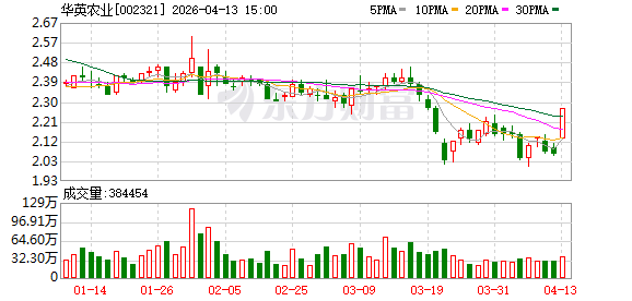或是受国资入主信号影响,二级市场回应积极。4月13日, 华英农业 收盘涨停,收盘价报2.27元/股,涨幅10.19%,总市值回升至48.42亿元。