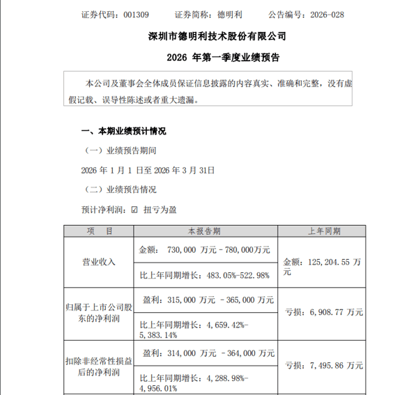 德明利 4月1日发布公告称,预计2026年第一季度归母净利润为31.50亿元至36.50亿元,同比增长4659.62%至5383.14%。