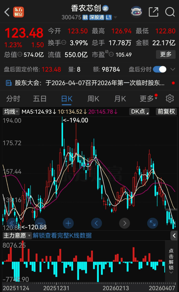 截至4月7日收盘,香农芯创股价报123.48元/股,涨幅达1.23%,总市值为574亿元。