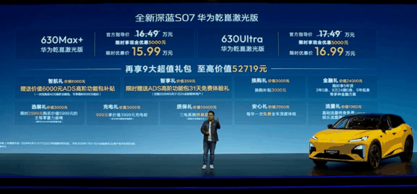 4月20日,搭载华为乾舱内激光、硬件和软件方面双重升级的全新深蓝S07正式发布。该车推出630Max+、630Ultra两个版本,官方指导价分别为16.49万元和17.49万元,限时优惠后售价分别为15.99万元和16.99万元。