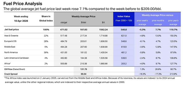 截至4月10日,全球航油均价分布(按区域)。图片来源:国际航协IATA