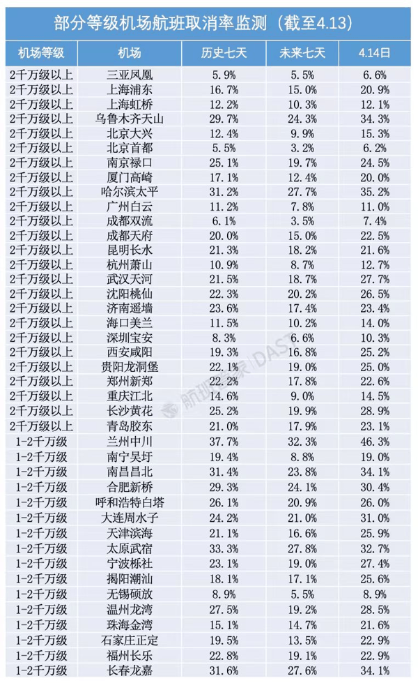 航班管家DAST数据显示,截至4月13日,未来七天我国民航客运航班量取消率达14.6%,随着时间推移,航班取消率可能仍会持续上升。截至目前,兰州、哈尔滨、乌鲁木齐等 机场 取消率显著高于全国平均水平。