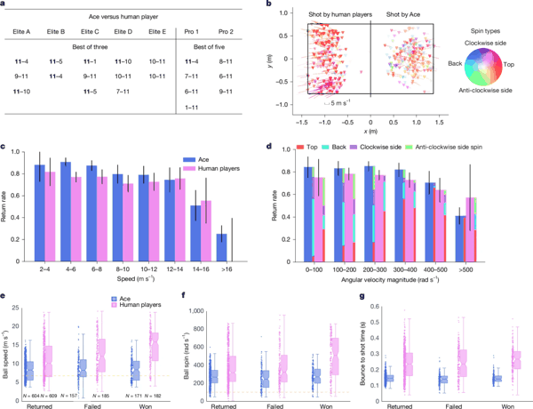 2025 年 4 月的比赛中,Ace 在与精英选手的五场比赛中赢了三场,共进行的 13 局比赛中赢得 7 局。Ace输掉了与职业选手的两场比赛,在七局比赛中赢下一局。它能稳定接住 14 米/秒以内的快球,面对高强度旋转回球率超过七成,发球直接得分的次数甚至比人类选手还要多,而且回球稳定、反应迅速,平均击球回合比人类职业比赛还要长,展现出了极强的持续对抗能力。